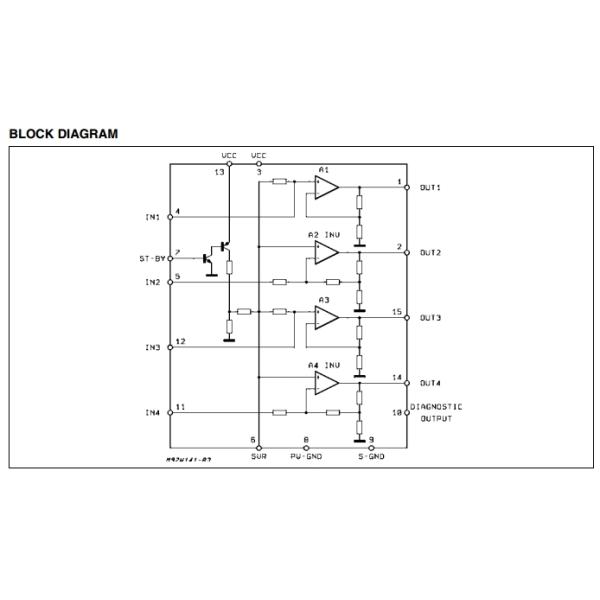 The exclusive fully complementary structure of the output stage and the internally fixed gain guarantee the highest power performances with extremely reduced component count. The on board clip detector simplifies gain compression operation. The fault diagnostic makes it possible to detect mistakes during the set assembly and wiring in the equipment.